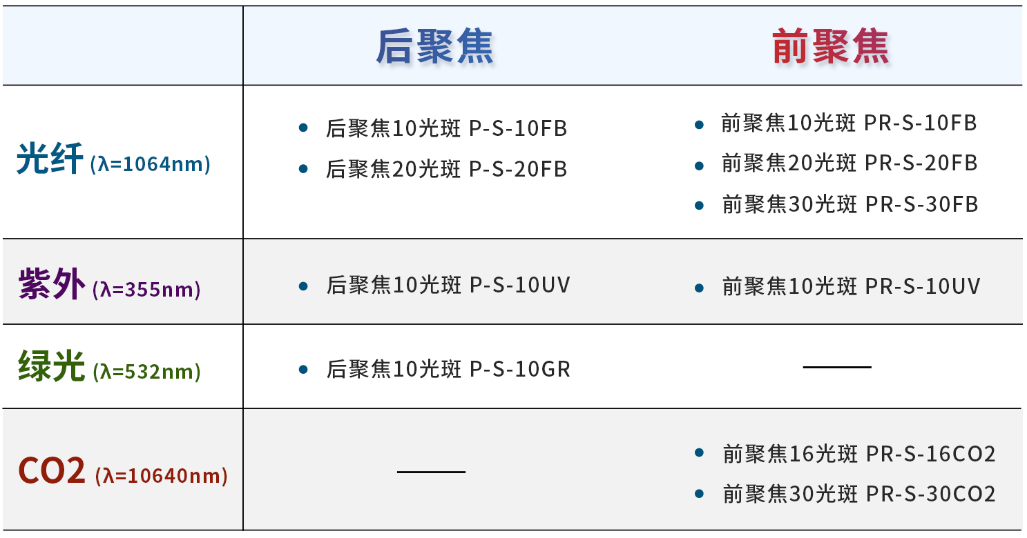 | 特点 | 光斑精细,集成性高,应用广泛 适合精密水晶内雕、玻璃钻孔与曲面标记等 | 在较大范围内有较好的光斑模式 适合较大尺寸曲面标记,对速度、功率与一致性均有苛刻要求的场镜 |