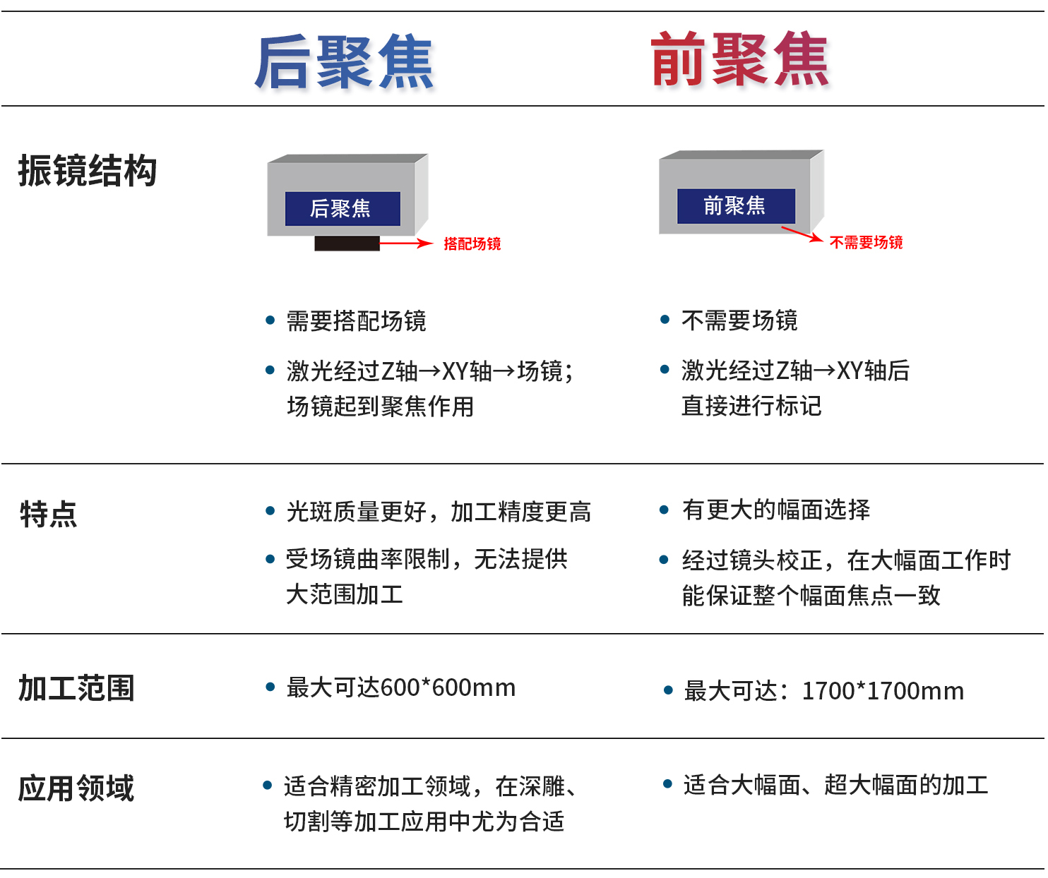 | 特点 | 解决后聚焦振镜,无法对较大幅面进行加工难题,最大幅面大1200*1200mm | 聚焦更小的光斑,更好的能量密度,支持更大的打标幅面1700*1700mm | |||||||||
